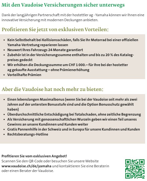 - Kein Selbstbehalt bei Kollisionsschäden, falls die Reparatur bei einer offiziellen Yamaha-Vertretung ausgeführt wird